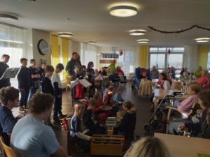 Zuerst ging es nach Östringen, wo die Seniorinnen und Senioren auf die musikalische Darbietung gespannt warteten. Mit gekonnten Handgriffen wurden die Instrumente platziert. Die Kinder stellten sich zum Gesang auf. Nach der musikalischen Eröffnung der geselligen Vormittagsstunde, begrüßte Herr Oerterer die Anwesenden. Danach ging es mit einem Gitarrenspiel weiter. Die Bewohnerinnen und Bewohner lauschten aufmerksam und man sah ihnen die Freude an, die die Kinder mit ihrer Musik brachten. Neben dem Chor und den Instrumenten wurde auch über den Heiland und das ewige Leben gesprochen –  auch, dass jeder Mensch eine Zukunft haben kann.